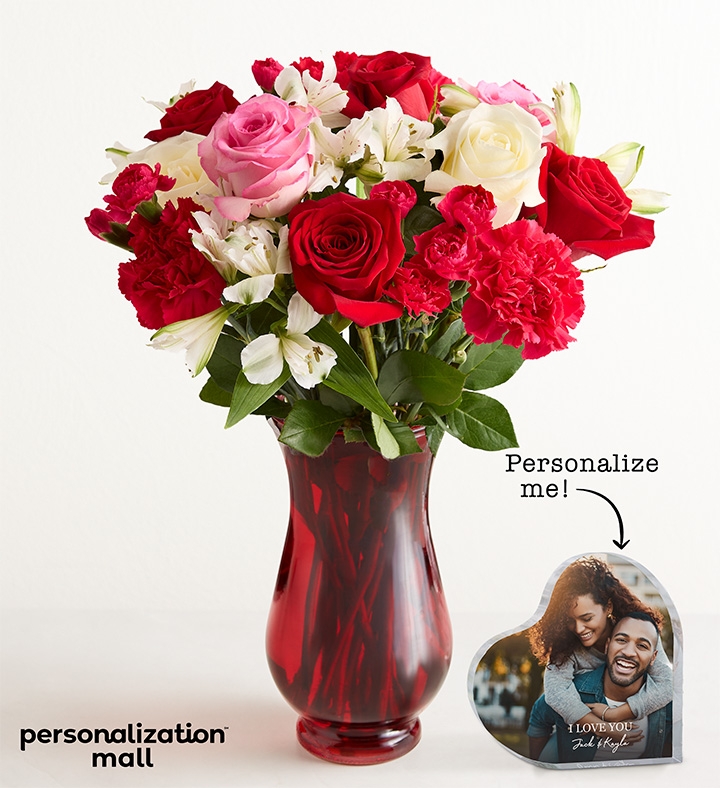 NEW Create a one-of-a-kind gift just for them with the Signature Sentiments collection, an exclusive collaboration with Personalization Mall. Show them how you feel, now and forever, with a heart-shape keepsake that you personalize with a two-line message and a photograph that means so much to them (and you). Make the gift even more meaningful with one of three special Valentine’s bouquets and an exclusive red vase.