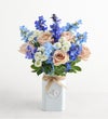 NEW AND EXCLUSIVE We’ve paired our popular Sweet As Can Bee artisanal vase with our 2026 Flower of the Year, the blue delphinium, to create a gift certain to delight. Pale roses and button poms add to the bouquet’s joie de vivre.