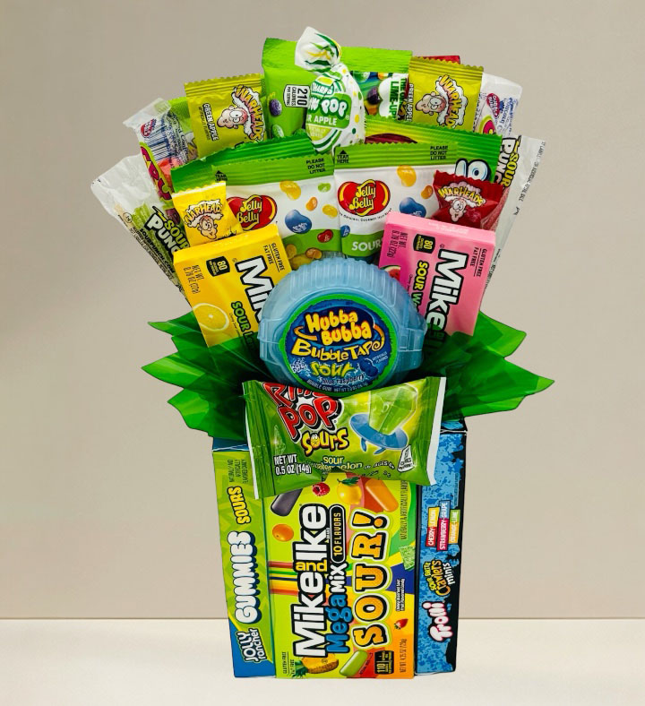 Get ready to tantalize your taste buds with our Pucker Up Sour Candy Bouquet! This bouquet is perfect for sour candy lovers who crave a burst of tangy, lip-puckering flavors.
